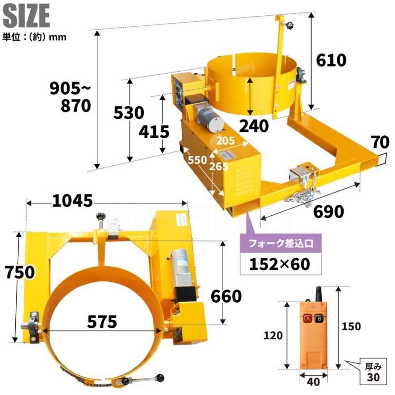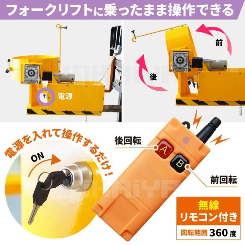 • 商品名 KIKAIYA 電動ドラム缶反転機 無線リモコン付き フォークリフト用