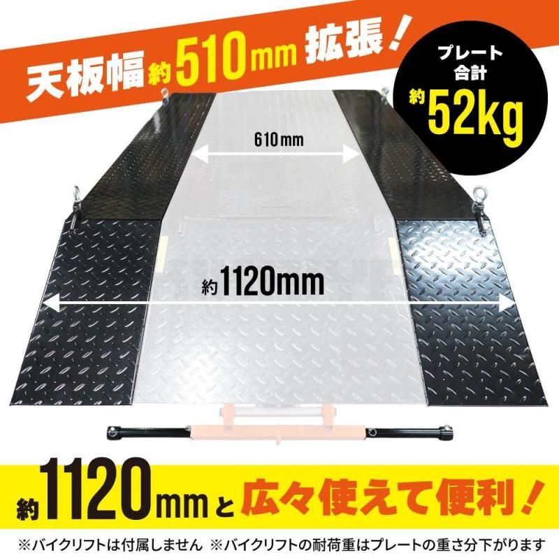 天板幅を約510mm拡張!広々使えて便利で快適 ※バイクリフトは付属しません ※バイクリフトの耐荷重はプレートの重さ分下がります ★バイクリフト本体(BL-8)はこちら |