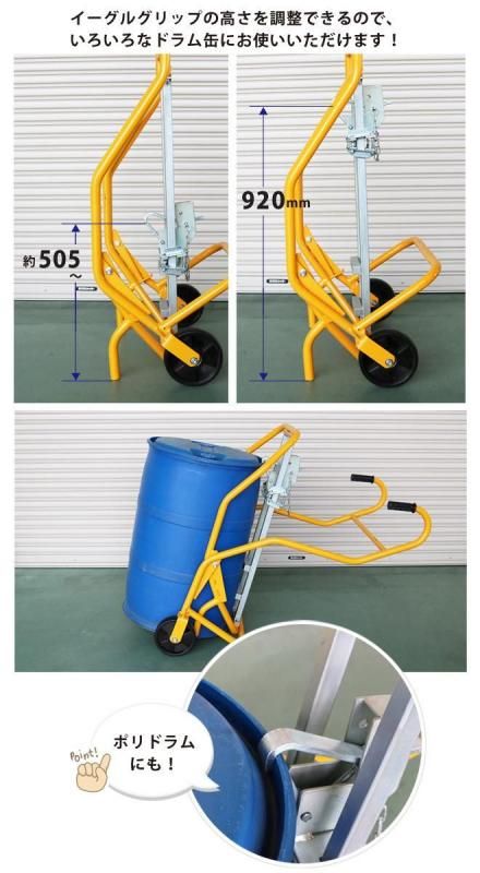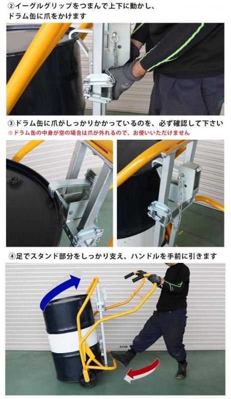 • 上下の高さを調節できるイーグルグリップは、さまざまなドラム缶をつかむ事ができます