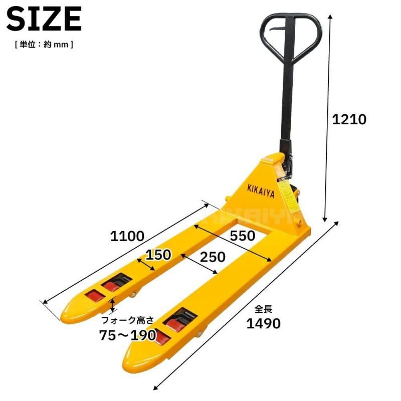 | サイズ | ・全長 1490mm ・フォーク長さ 1100mm ・フォーク全幅 550mm ・フォーク爪幅 150mm ・フォーク間 250mm ・フォーク最高/最低高さ=190/75mm |